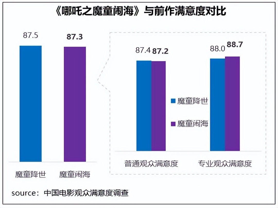不管是普通观众还是专业观众,都对《哪吒之魔童闹海》给予极高评价。普通观众满意度为 87.2 分,专业观众满意度更是达到 88.7 分,分别位居历史调查动画影片的第二、第一位。在多个细分维度,如视觉效果、音乐效果、精彩对白等指标得分均超过 87 分,广受观众喜爱。